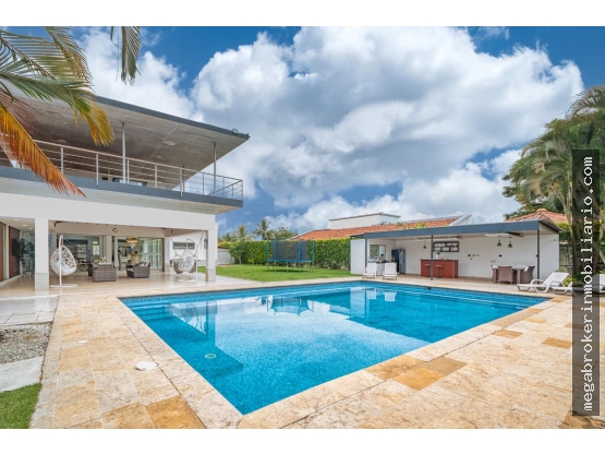 primer piso: cinco habitaciones todas con baños y aire acondicionado, sala comedor, sala exterior, cocina integral, zona de oficios, parqueadero para cuatro autos techado, bodega.